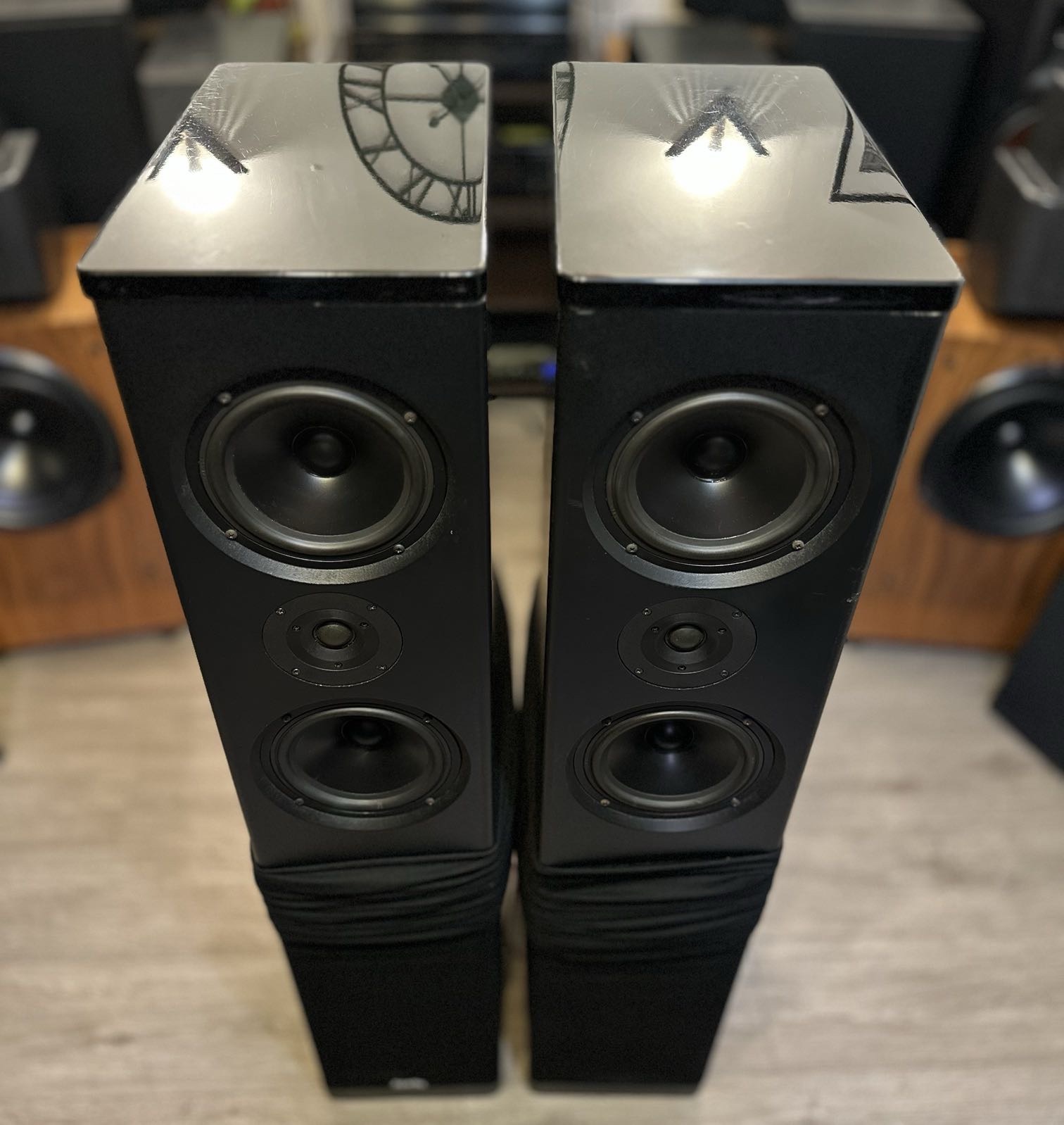Complemento de drivers: varios woofers de ~6.5” + tweeters de 1” en arrays tipo D’Appolito (configuración multitransductor por torre).